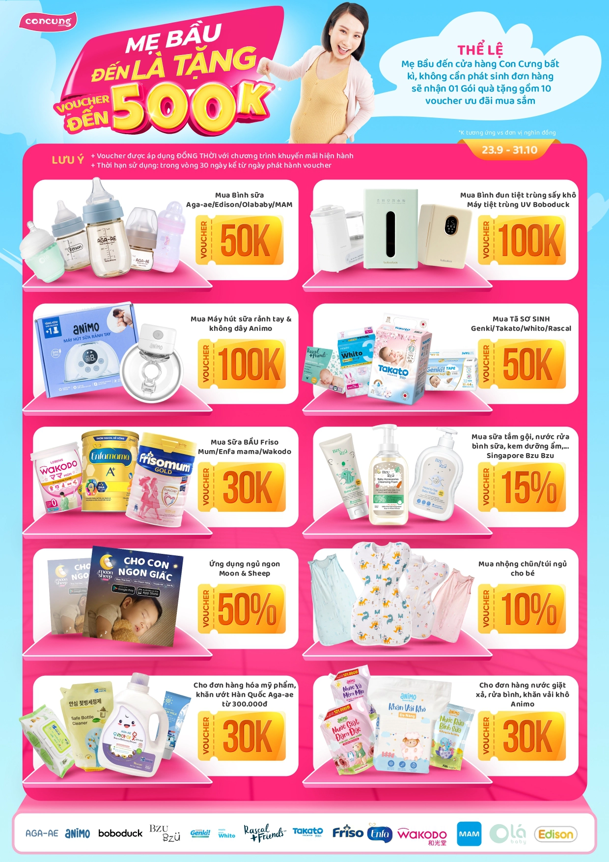 Từ ngày 23/09/2023 đến ngày 31/10/2023, tất cả khách hàng là Mẹ bầu khi đến tham quan tại hệ thống cửa hàng Con Cưng trên toàn quốc được tặng 01 gói quà tặng bao gồm 10 mã giảm giá áp dụng mua các sản phẩm tại Con Cưng (không áp dụng đối với sữa thay thế sữa mẹ cho trẻ dưới 24 tháng tuổi). Cụ thể: