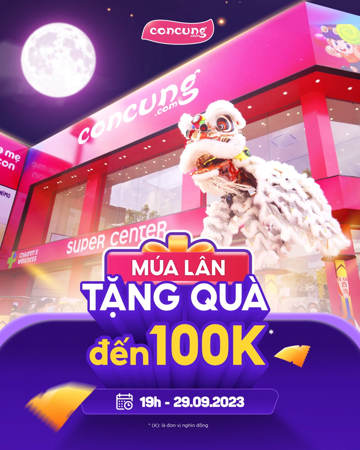 Đặc biệt chỉ cần đến xem múa lân ba mẹ sẽ được tặng đến 100K mua Vitamin, Thực phẩm, Thời trang, Phụ kiện và Đồ chơi bất kỳ. Chương trình được áp dụng đồng thời cùng các chương trình khuyến mãi khác của Con Cưng.