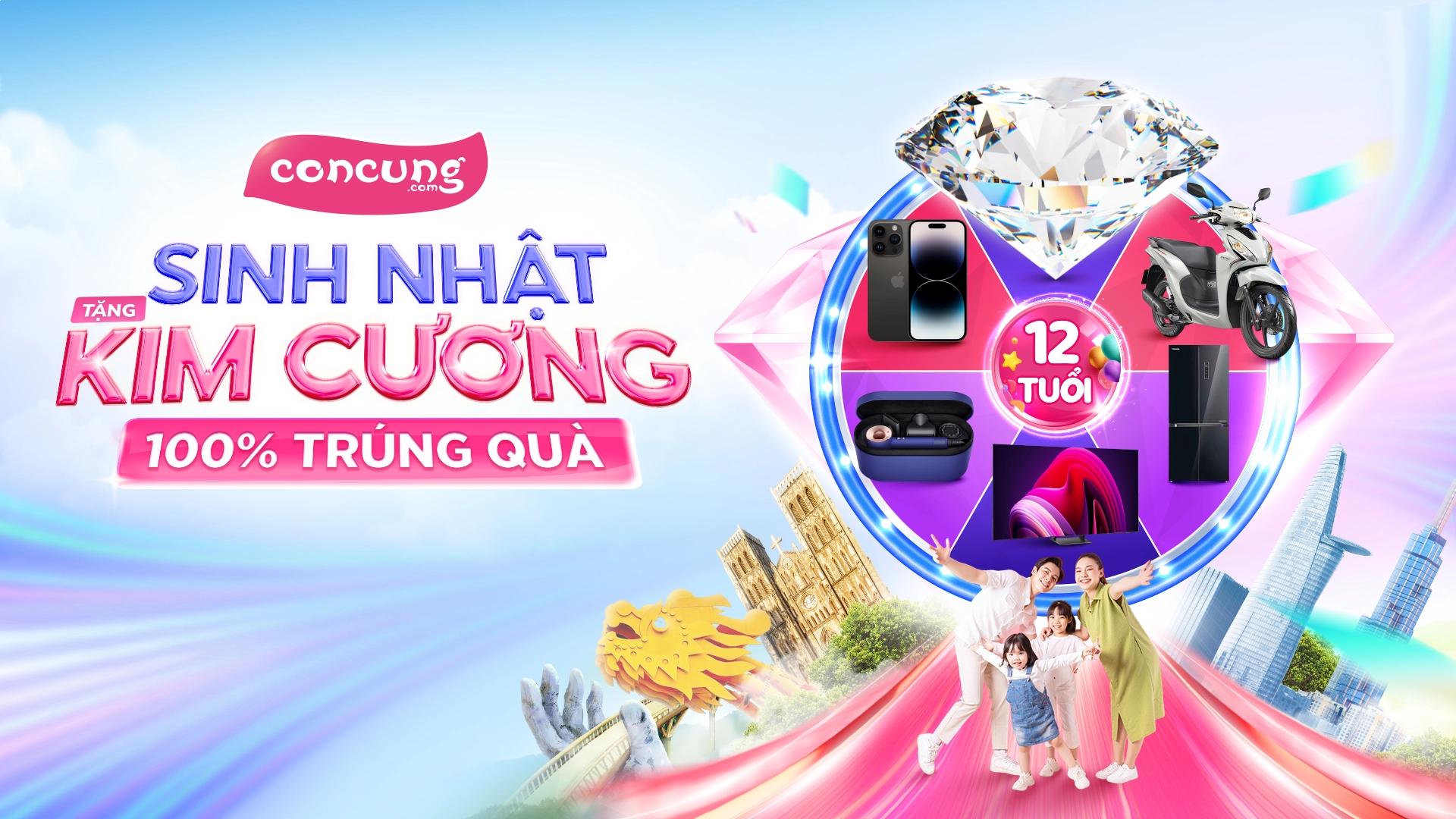 Đồng hành cùng Con Cưng trong sự kiện mừng sinh nhật 12 tuổi, 11 nhãn hiệu tã bỉm uy tín hàng đầu triển khai chương trình vòng quay may mắn 100% trúng quà: tủ lạnh, robot hút bụi lau nhà, máy lọc không khí, tivi, iPhone 14 Pro, iPad Gen 10, nồi cơm áp suất,... Để có cơ hội quay thưởng nhận quà, ba mẹ chỉ cần mua sắm tã từ 500.000đ, áp dụng cho các nhãn hàng dưới đây.